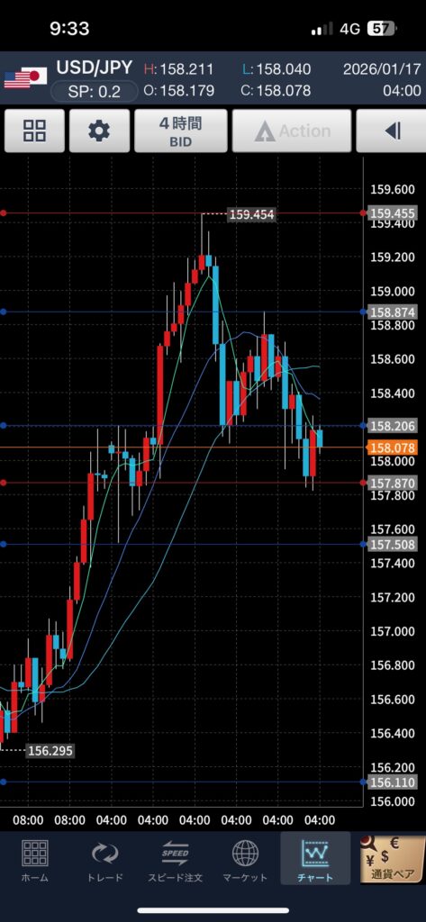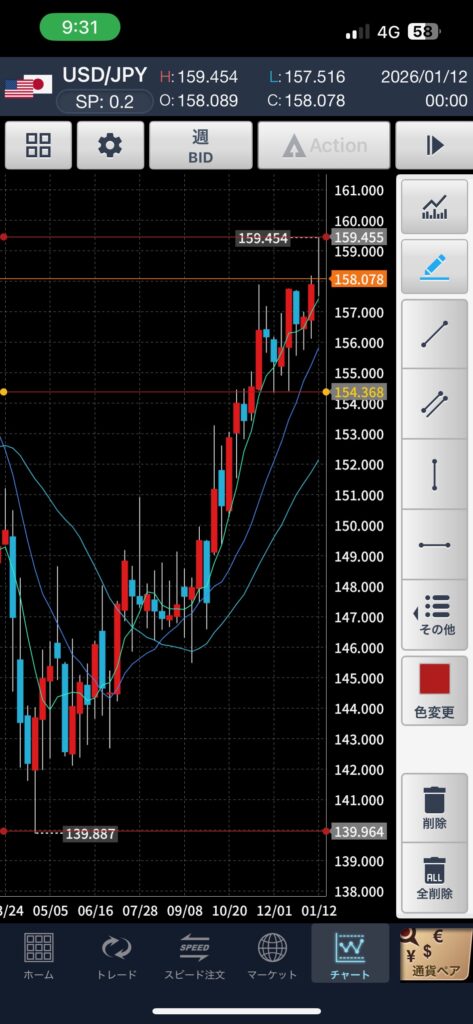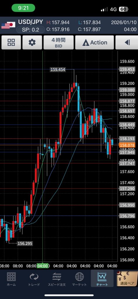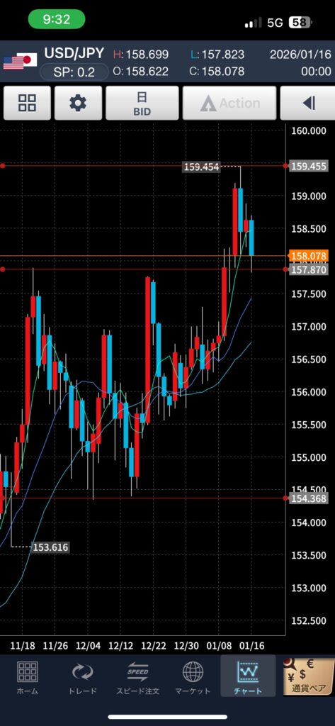 適当にほったらかしでチャート見てみたら、159.4ぐらいまで上がっていました。